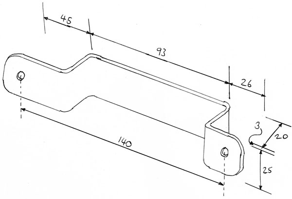 You can achieve the same volume as the Magnum by using 2 HF80 discs. They come as a dischordant pair, emitting 340 and 430Hz from 9A combined. Due to their smaller dimensions these could be installed easily using the existing horn mounting point, but they will be clearly visible as an addition. A better option is to mount them on the front of the bike frame under the oil cooler, using a bracket fashioned according to the dimensions below. I used 3x25mm aluminium strip bent in a bench vice.