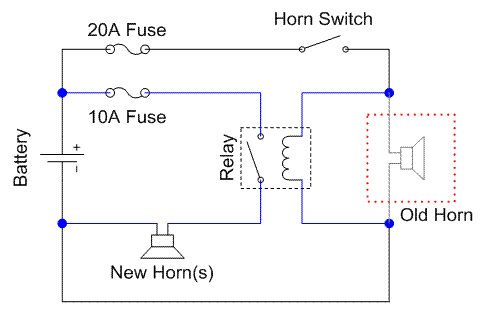 So why is a relay useful? You can use a low-power source to energise the coil to switch power to a high-power device (like a horn!) The circuit diagram below shows the installation of a relay into the existing horn setup. All the existing circuit is shown in black, and the new addition is shown in blue.