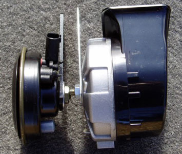 Direct plug and play, no hardware modifications required. 130dB, 4A current draw. Around $15 at Pep Boys, etc. ("HK-9 C" High Tone) ("HK-9 D" Low Tone)