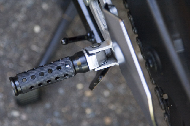 The stock pegs rely on a metal washer compressing against the rubber of the pegs to provide the flip-up-flip-down action. These pegs will flip up if you ground them on a corner, but the movement is limited by the upper corner of the sides of the peg bracket slot (because aluminium doesnt compress like rubber!). If you were inclined you could round this off with the angle-grinder, but the movement even without this alteration is more than enough for some pretty spirited riding.