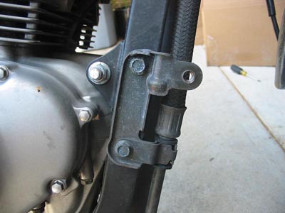 You can also remove the small metal brackets that hold the fairing onto the frame. It is not a bad idea to screw the bolts back into the holes in the frame to prevent water from entering it. Note that the brackets at the front holding the oil cooler lines on cannot be removed (below).